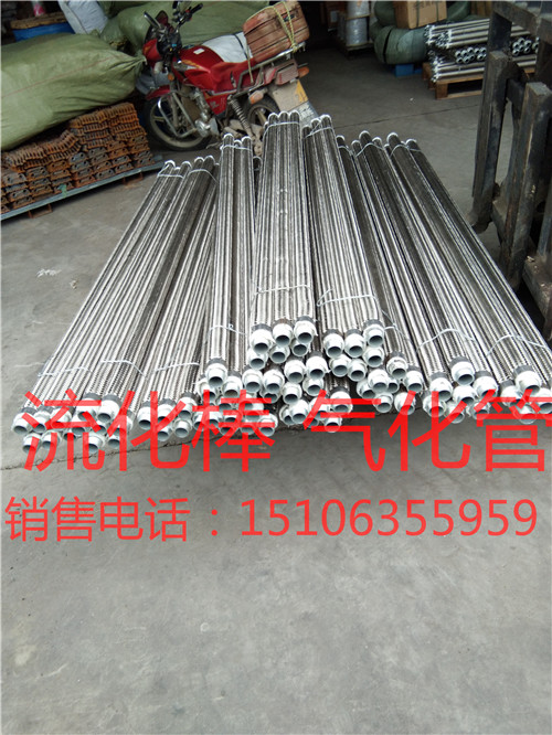 流化棒内管是选用热镀锌的钢管,首先由带钢三面冲孔,冲孔直径为6mm,以后采用高频焊焊接成管,在镀锌管外包裹两层专门定制一面绒面一面光面的300g/m2滤布,滤布外套有耐磨、耐腐蚀不锈钢波纹管,最后用400吨八口缩管机进行缩口,即保证了气化管良好的透气性,又避免物料进入气化管,延长了气化管使用寿命。库内安装均化装置,库内均化装置是我公司的专业设计,在出料及出库率的效果上能达到90%以上,我公司采用均化装置是我公司生产的流化棒,安装在库内填充斜面上,安装是按库内扇形排列安装,安装分为2环,减压锥内一环,减压锥外一环,每个扇形分为6个供气区域,6个区分为3个大区,供气为对称循环供气,安装间距大的是500mm,最小的是 300mm,安装的流化棒能在整个钢板库内达到每一个地方无死角,流化棒优点在于间距小,透气为4边透气,彻底达到均化效果,提高物料出库率。我公司提供的气化控制箱,为全自动电器操作系统,自动循环供气设计。